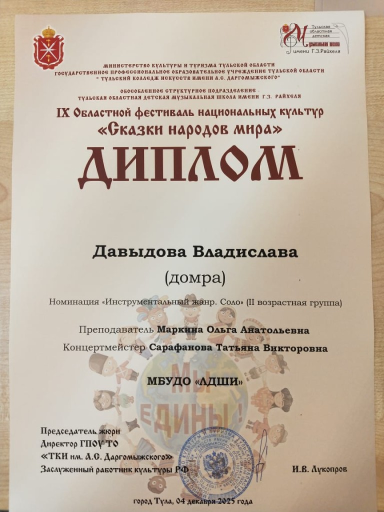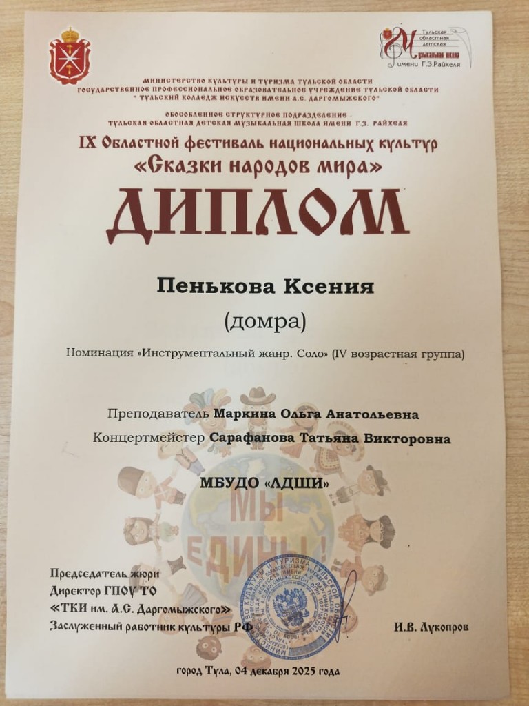(преп. по классу домры Козлова Людмила Викторовна, концертмейстер Сарафанова Татьяна Викторовна)