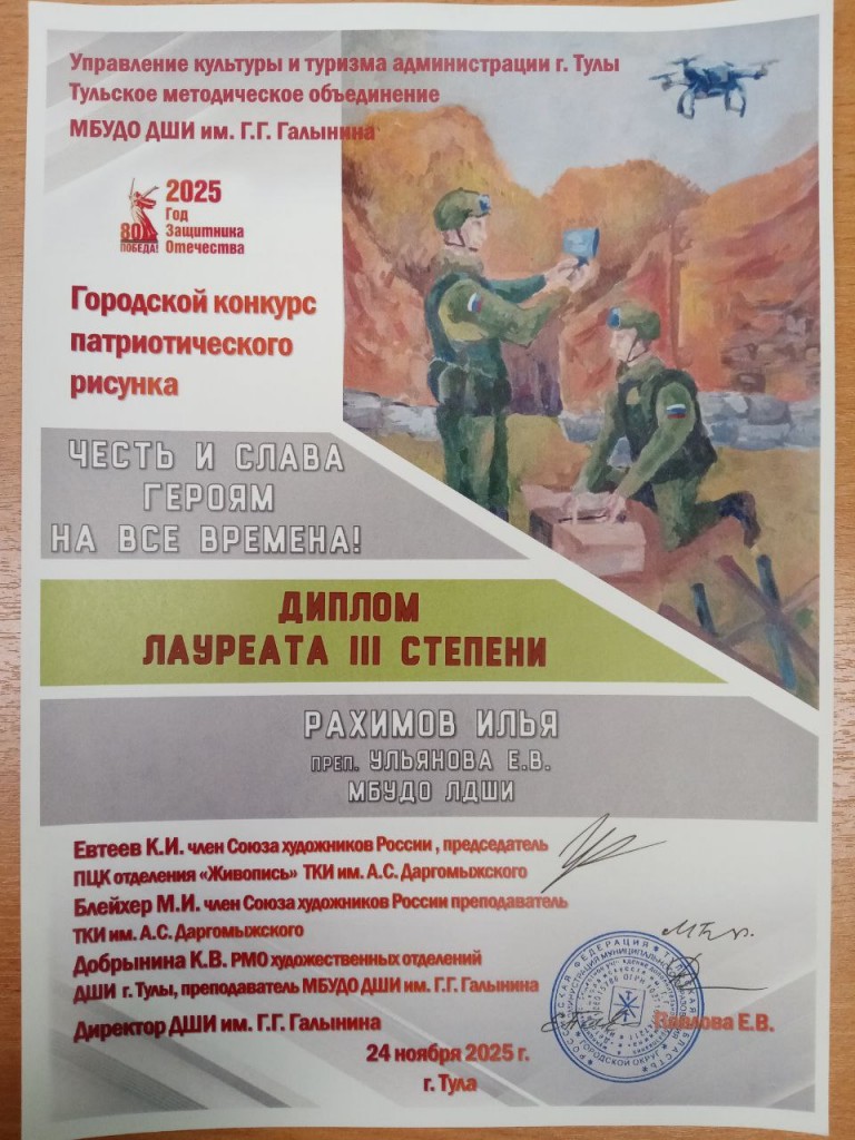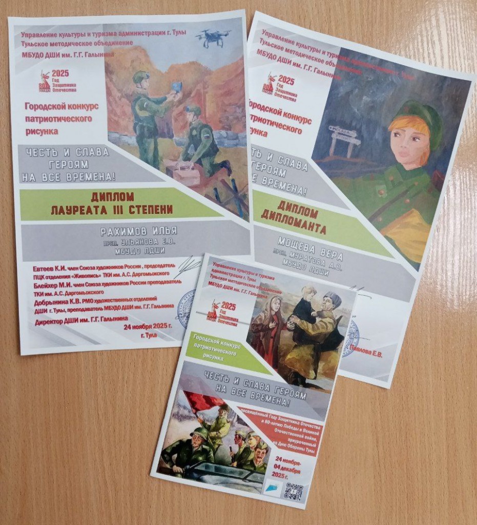 Поздравляем учащихся художественного отделения, преп.Муратова Анна Владимировна и Ульянова Евгения Владимировна, с успешным участием в Городском конкурсе патриотического рисунка «Честь и Слава героям на все времена»: