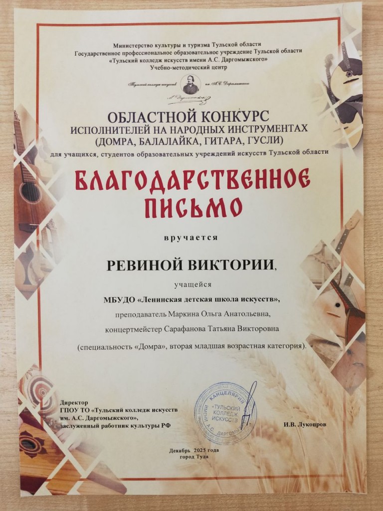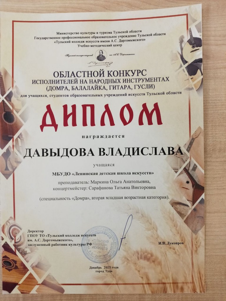 Поздравляем учащихся класса домры, преп.Маркина О.А., конц.Сарафанова Т.В., с участием в Областном конкурсе исполнителей на народных инструментах (домра, балалайка, гитара, гусли) - учащихся, студентов образовательных учреждений искусств Тульской области: