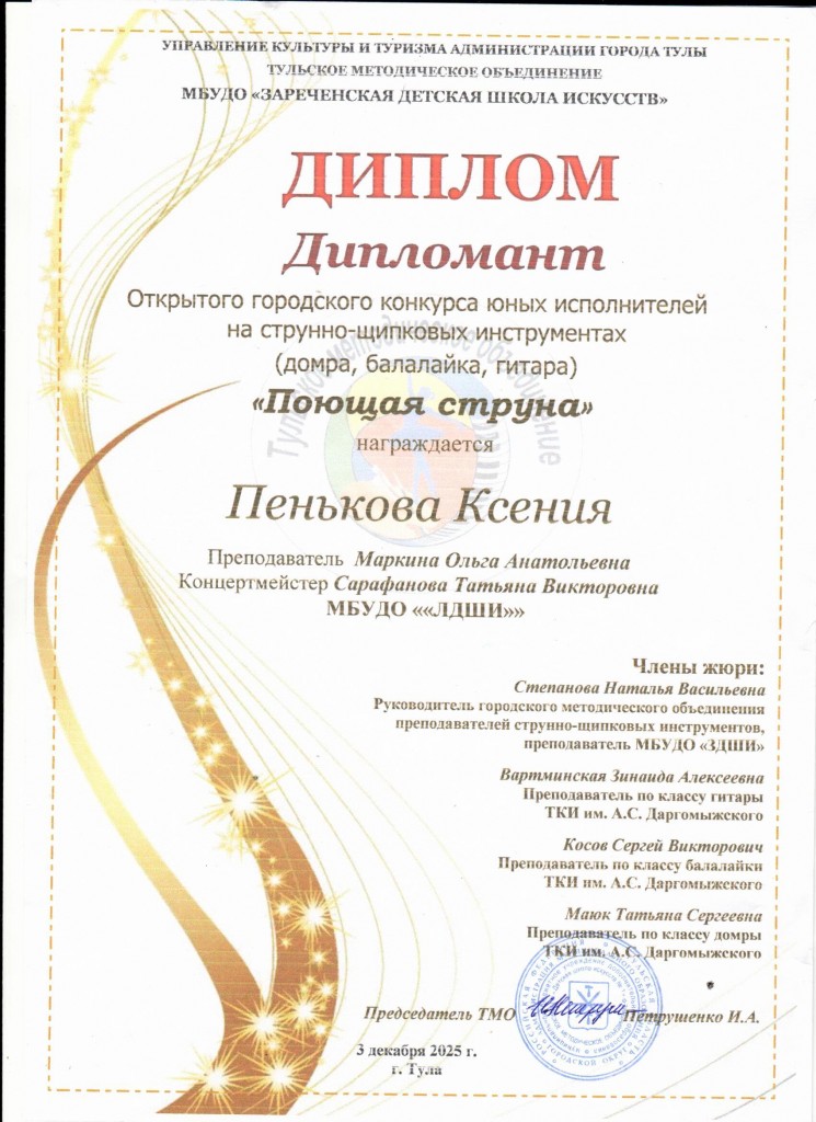 Поздравляем учащуюся класса домры, преп.Маркина О.А., конц.Сарафанова Т.В., с участием в Открытый городской конкурс юных исполнителей на струнно-щипковых инструментах (домра, балалайка, гитара) «Поющая струна»: