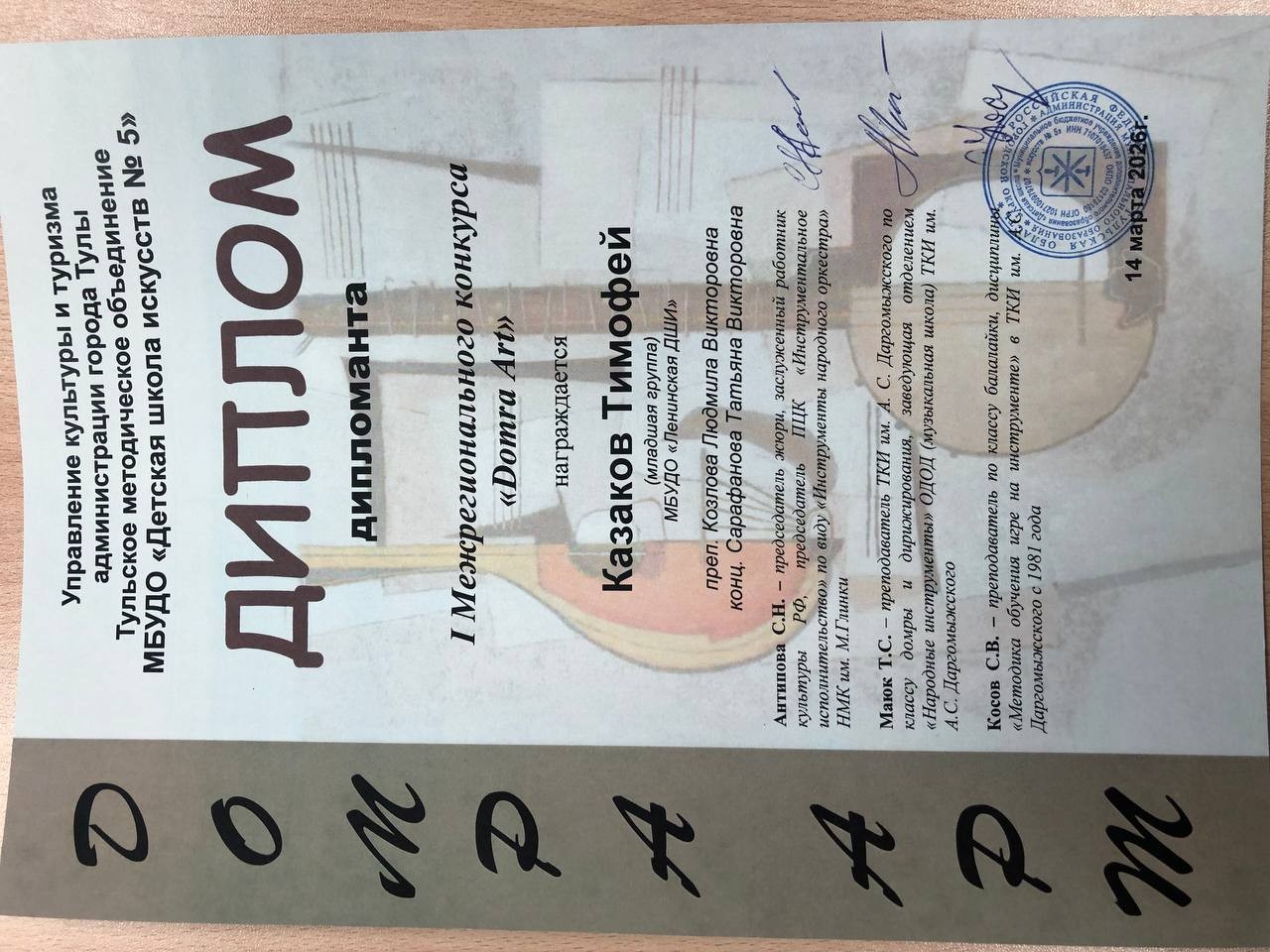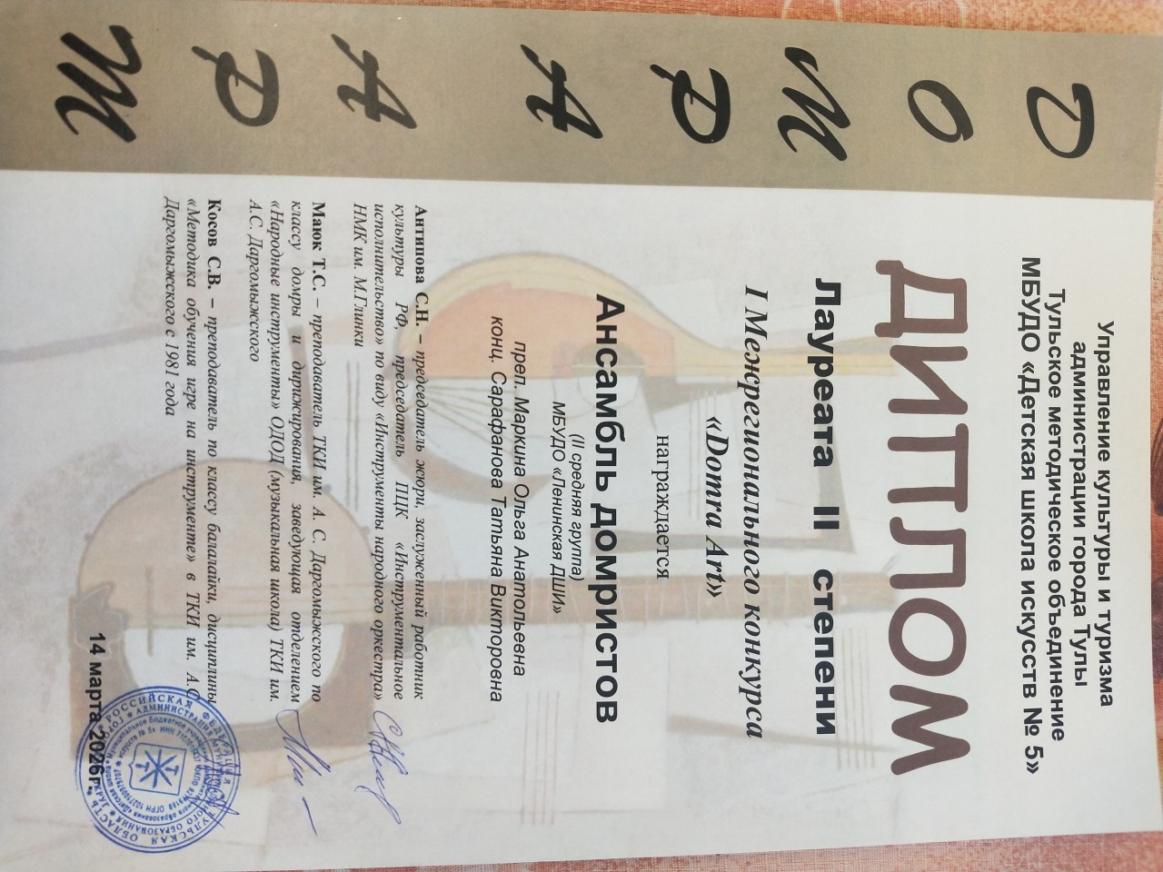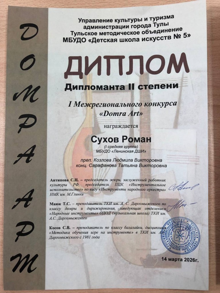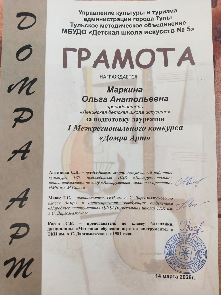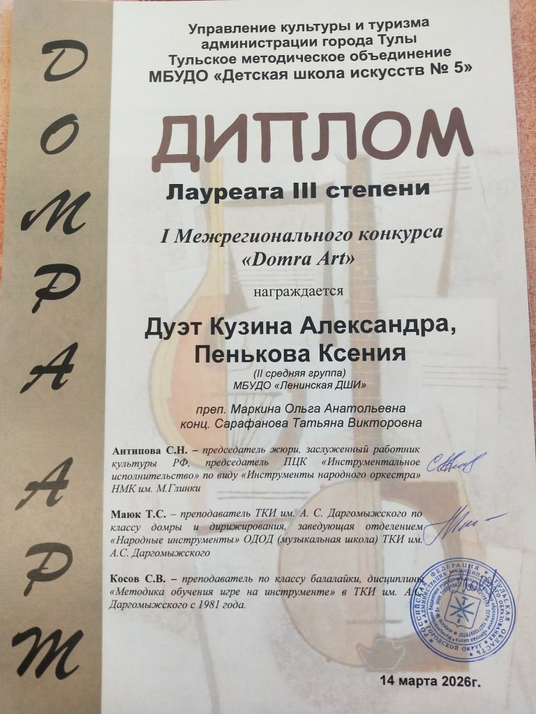Поздравляем учащихся класса домры с победой во I Межрегиональном конкурсе «Domra Art»: