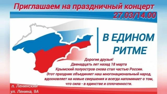 Дорогие друзья, ждем вас на творческий концерт "В едином ритме", посвященный знаменательной дате «Дню воссоединения Крыма с Россией»- это признание в любви своей стране языком музыки, доступным и понятным каждому сердцу.