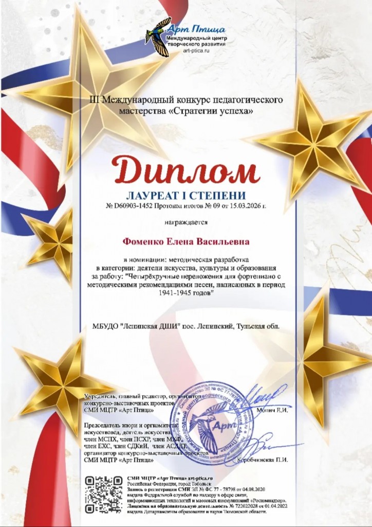 Поздравляем заведующую фортепианным МО, преподавателя по классу фортепиано нашей школы Фоменко Елену Васильевну с получением диплома Лауреата I степени в Международном конкурсе педагогического мастерства "Стратегии успеха".