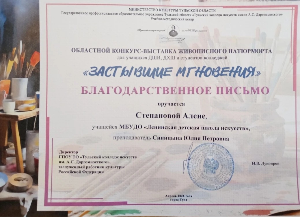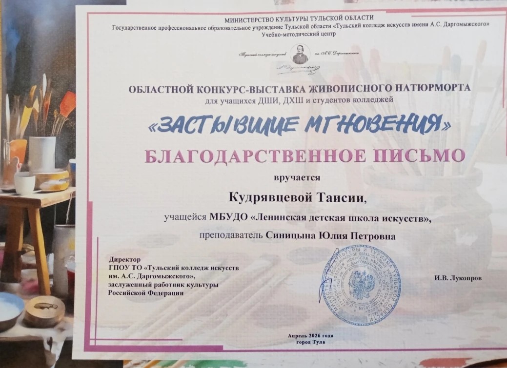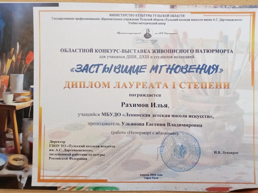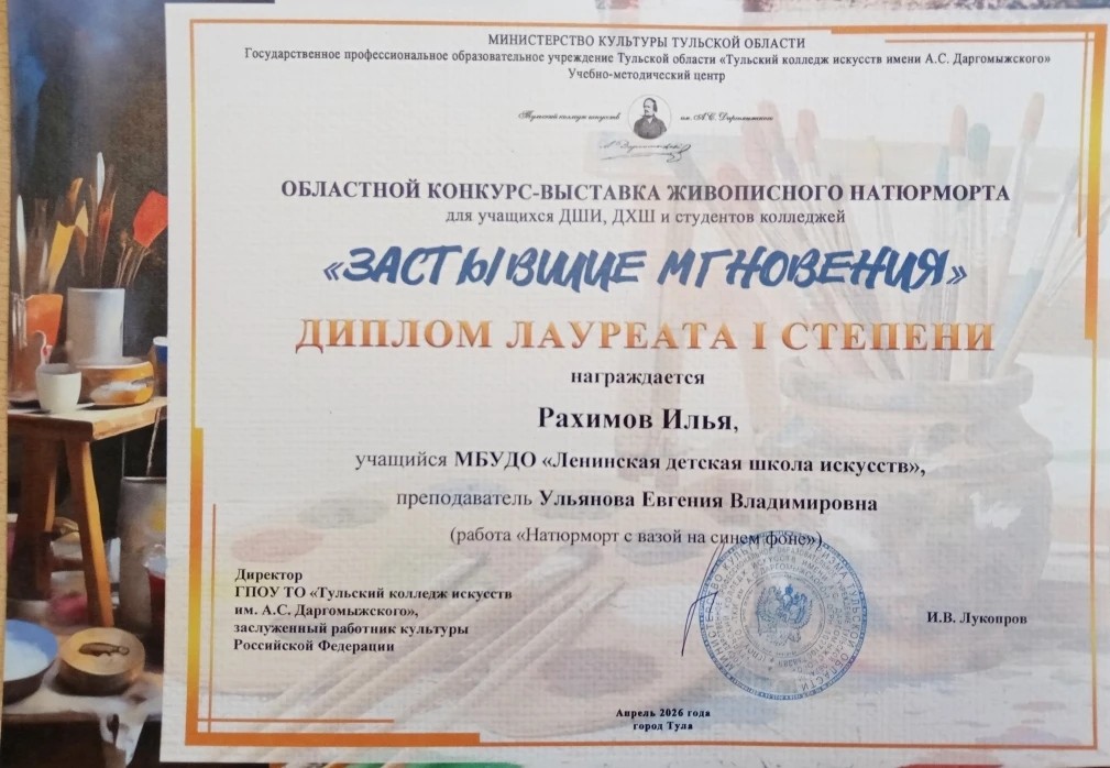 Поздравляем учащихся художественного отделения с победой в Областном конкурсе-выставке живописного натюрморта "Застывшие мгновения":