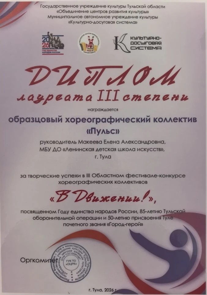 Поздравляем Образцовый хореографический коллектив "Пульс" (рук. Макеева Е. А., преподаватель Ткач Т.А.) со званием Лауреата 3 степени!
