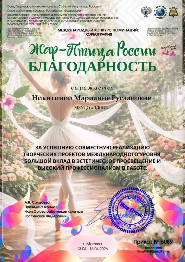 Никитина Марианна Руслановна награждена Благодарностью конкурса.