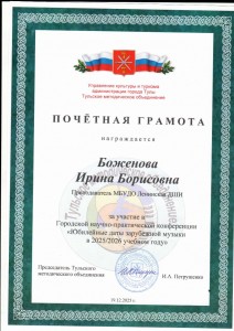 Преподаватель школы Боженова Ирина Борисовна награждена почетной грамотой за участие в конференции